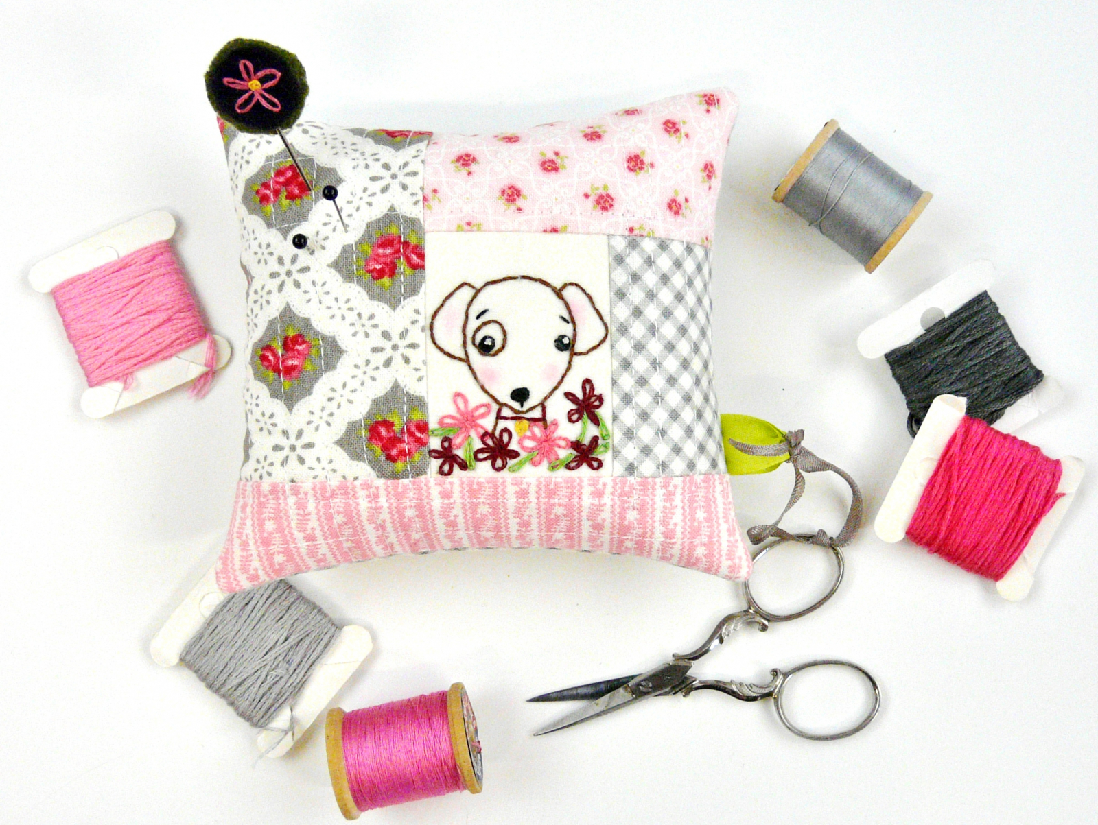 Puppy and Posies Pinnie Embroidery & quilted pincushion pattern #414